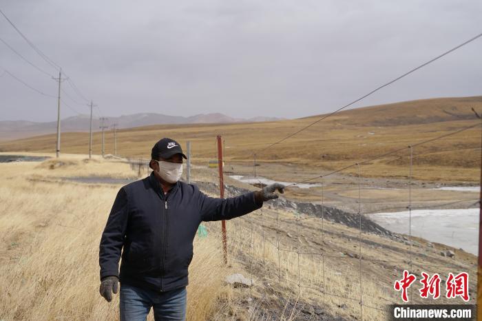 今年3月,久買正在查看種草復綠區(qū)域的網(wǎng)圍欄?!≈行律缬浾?李雋 攝