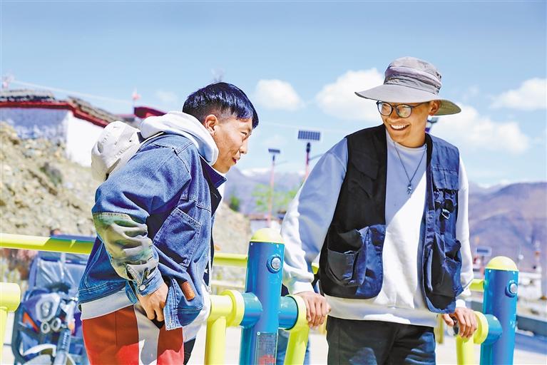 塔巴村村民在家門口的健身器材上鍛煉。