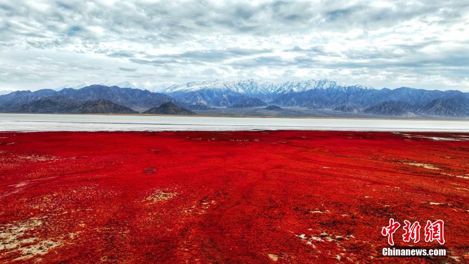 近日,在位于柴達木盆地的青海省海西蒙古族藏族自治州烏蘭縣都蘭湖國家濕地公園,岸邊的鹽生植物鹽爪爪將大地染成了紅色,黑頸鶴、斑頭雁、鵝喉羚等重點保護動物在“大地紅毯”上嬉戲、覓食、休憩……攝影愛好者記錄下這美好、愜意的畫面,畫面中巨大的“紅地毯”與藍天、白云、雪山交相輝映,宛若宮崎駿筆下的童話世界。圖為鹽生植物鹽爪爪染紅了大地。
