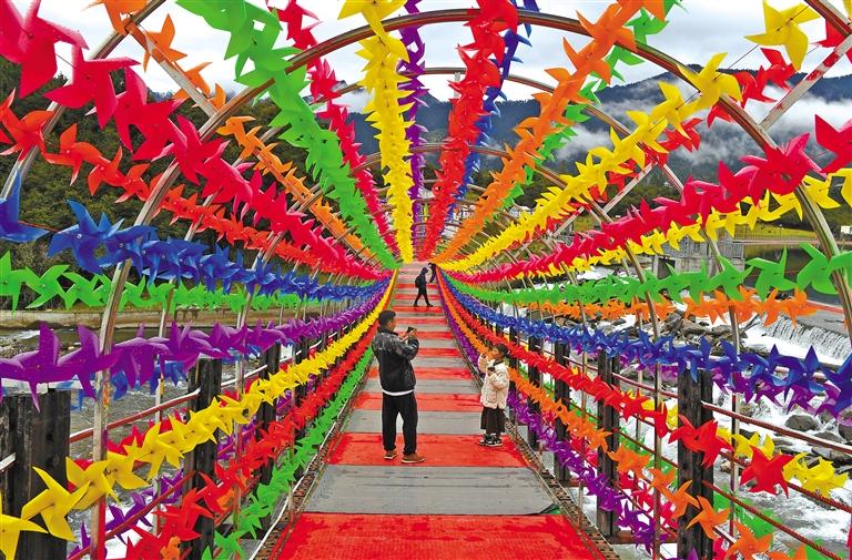 游客在林芝市魯朗鎮(zhèn)扎塘魯錯吊橋拍照留念。記者 洛桑 攝