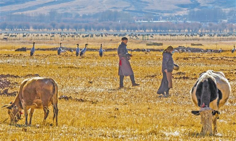 卡孜濕地是其中一個(gè)投食點(diǎn)?,F(xiàn)年43歲的洛桑次旦就住在附近,每天一大早,他都會(huì)到卡孜濕地放牧?!啊従印絹碓蕉嗔耍畮啄甑臅r(shí)間,黑頸鶴的數(shù)量從幾只增長(zhǎng)到幾百只。”洛桑次旦告訴記者,黑頸鶴和牛各吃各的,互不干擾,非常和諧。
