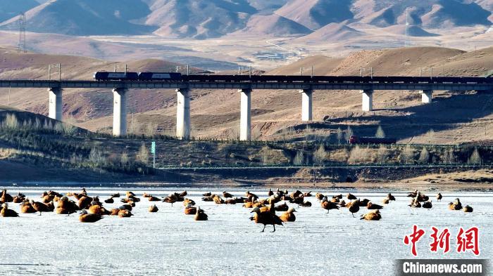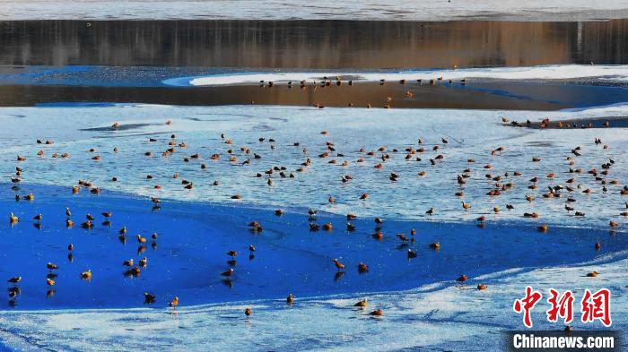 高原冬日,在位于青海湖北岸的青海省海北藏族自治州海晏縣境內(nèi),成群的赤麻鴨、綠頭鴨等鳥類現(xiàn)身青海省東大灘水庫(kù),它們時(shí)而“泡湯”洗浴,時(shí)而振翅高飛,時(shí)而覓食嬉戲,展現(xiàn)出一幅冬日和諧的美好畫面。近年來(lái),越來(lái)越多鳥類來(lái)到青海湖北岸覓食休憩,此時(shí)一半冰層一半碧波的東大灘水庫(kù)成了鳥類覓食的好去處。