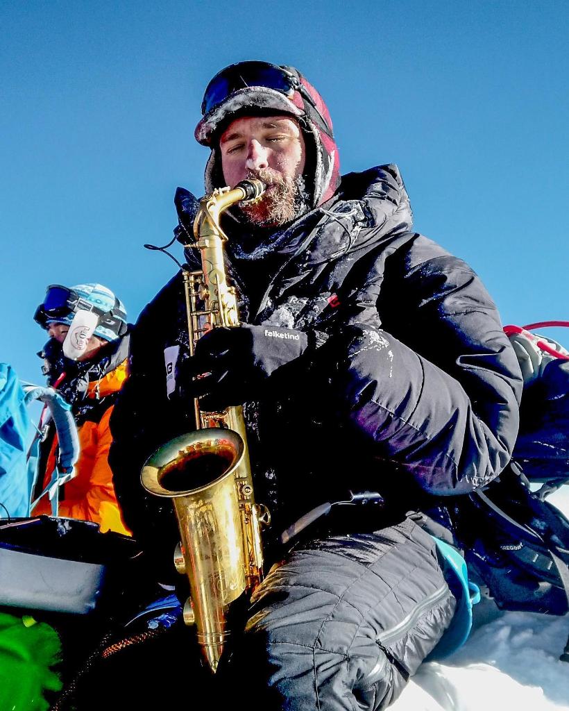 2019年哈康·埃蘭森從南坡登頂珠峰后在頂峰吹奏薩克斯(受訪者供圖)
