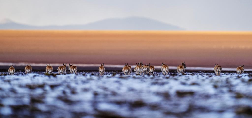 6月15日清晨雪后,在羌塘國家級自然保護區(qū),迎著朝霞前行在遷徙路上的一群藏羚羊。