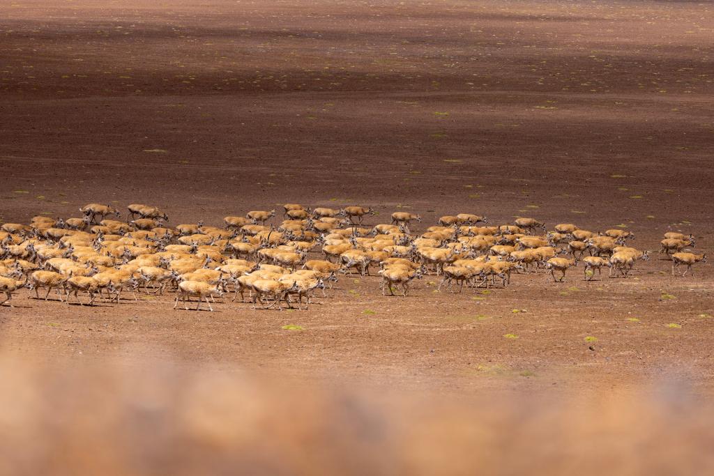 大群遷徙的藏羚羊在甜水河畔的荒灘上向產(chǎn)羔地遷徙(6月14日攝)。