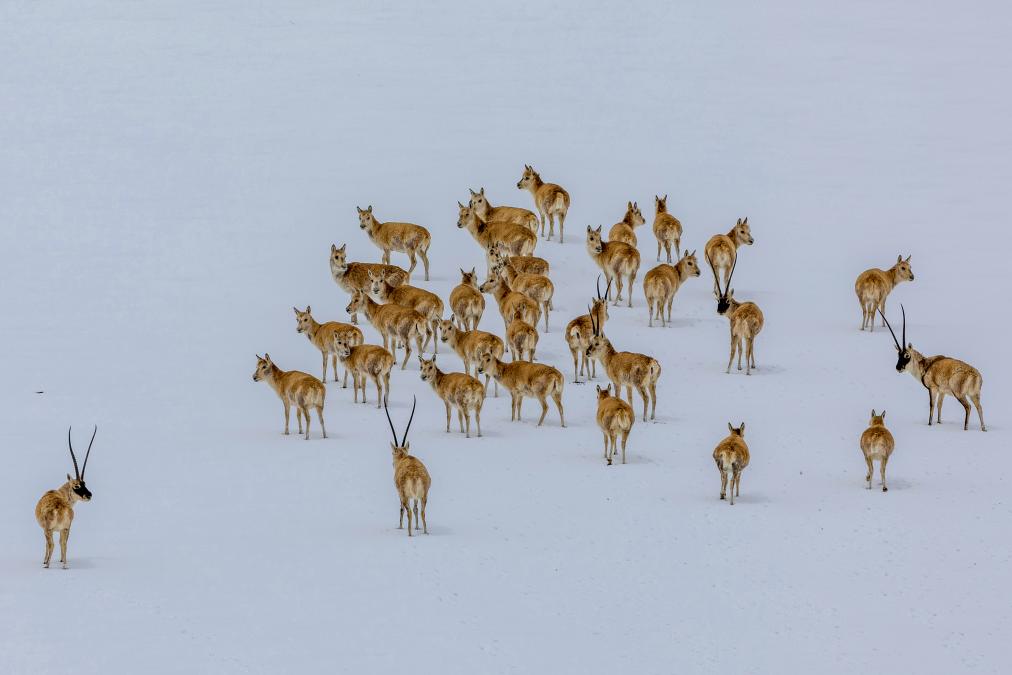 一群藏野驢在雪地中注視著遷徙的藏羚羊(5月8日攝)。