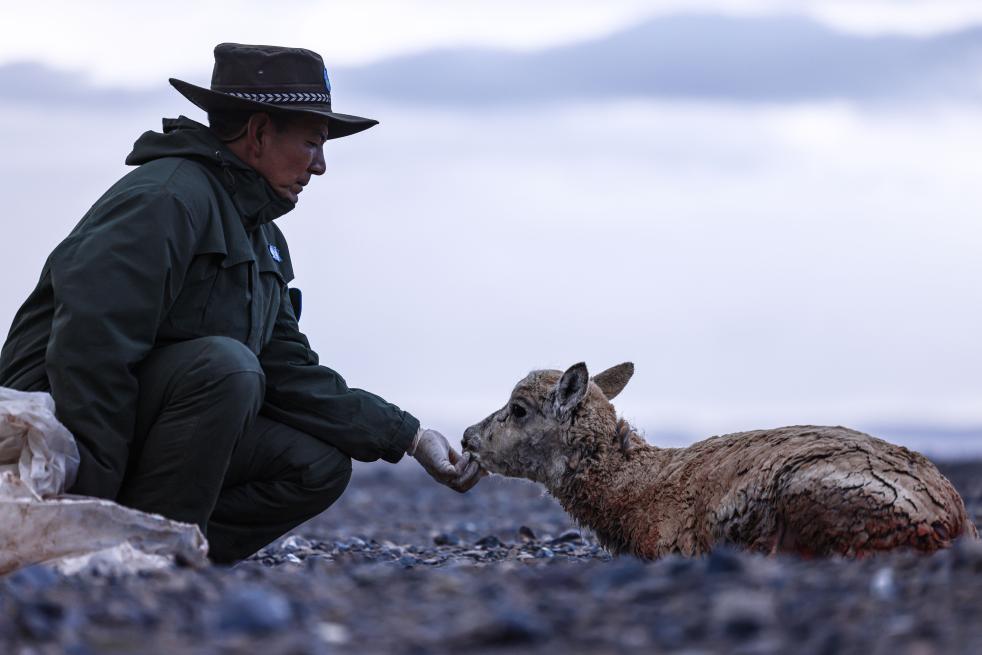羅布嫻熟地用酒精清潔創(chuàng)面,手持針線慢慢地縫合她的肚皮——這場(chǎng)手術(shù)進(jìn)行了50分鐘,母藏羚羊漸漸可以動(dòng)了,她用鼻尖蹭了一下羅布的手,掙扎著起身,緩緩?fù)鶘|走去——那里是產(chǎn)羔地。