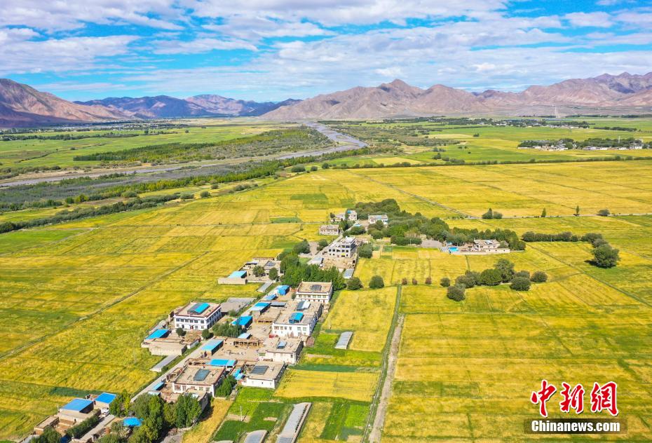 8月25日,西藏日喀則白朗縣仁青崗村,田園、村莊、河流、公路、遠(yuǎn)山交相輝映,構(gòu)成一幅美麗的田園風(fēng)光畫卷。(無人機(jī)照片)