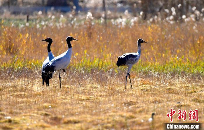 圖為11月3日,黑頸鶴在西藏拉薩達(dá)孜區(qū)棲息。中新社記者 李林 攝