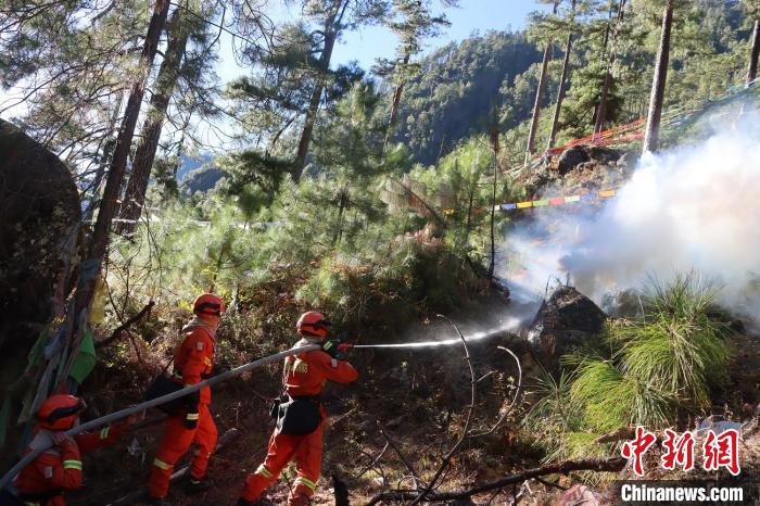 圖為消防員正在撲滅火源。西藏林芝市察隅縣森林消防中隊 供圖