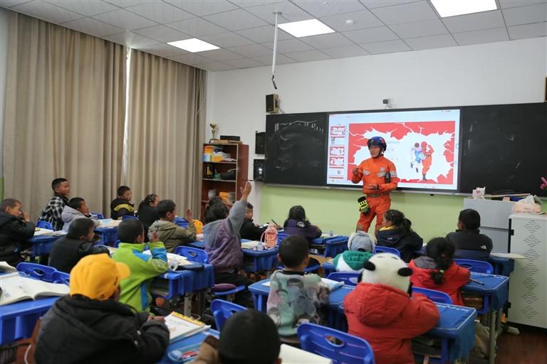 消防員向師生普及地震應(yīng)急避險(xiǎn)常識(shí)。記者 格桑倫珠 通訊員 仁青卓瑪 攝