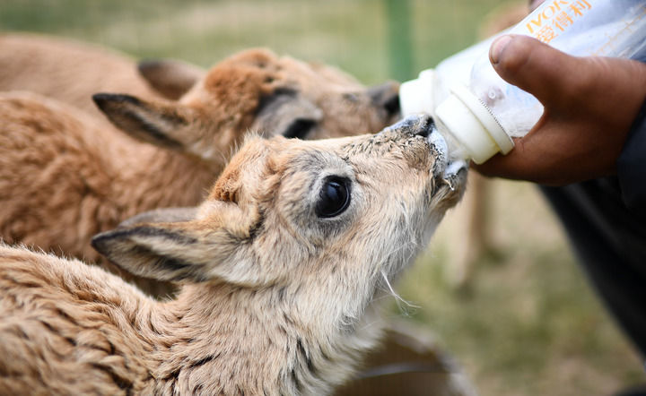 在索南達(dá)杰保護(hù)站,可可西里巡山隊(duì)隊(duì)員在給被救助的藏羚羊幼仔喂奶(2023年7月28日攝)。新華社記者 張宏祥 攝