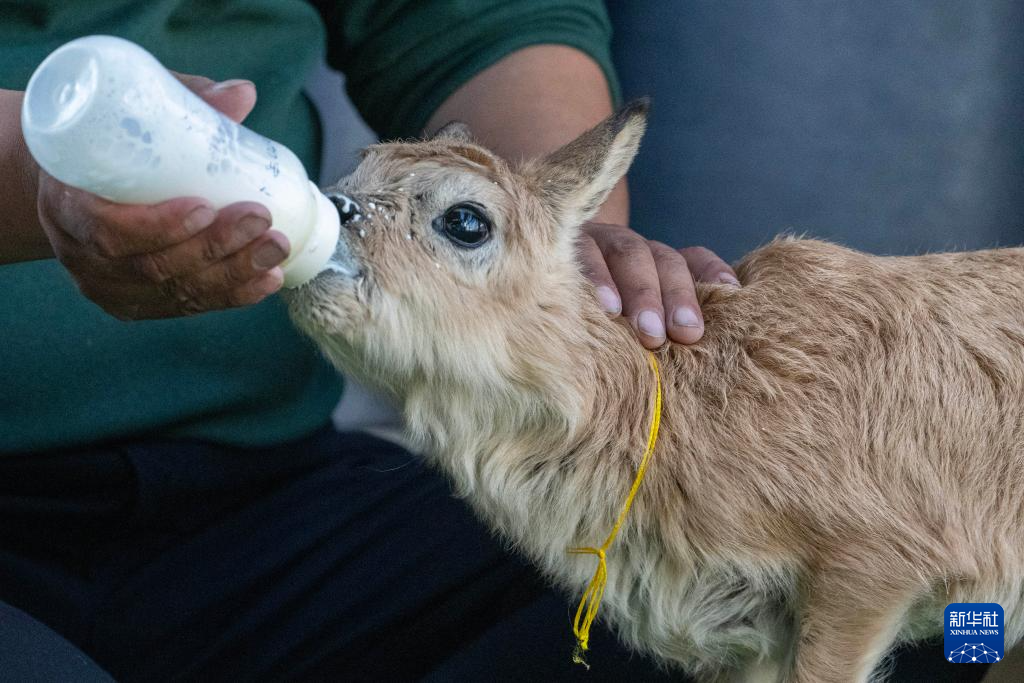 措羅木管理站站長(zhǎng)阿旺洛卓在給藏羚羊幼崽喂奶(7月16日攝)。新華社記者 姜帆 攝