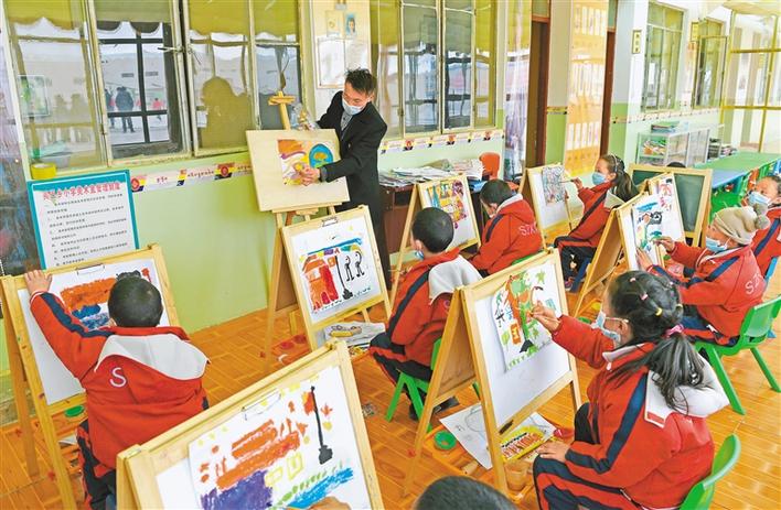 圖為買巴鄉(xiāng)小學(xué)學(xué)生正在課堂上以繪畫的方式表達(dá)對(duì)偉大祖國的熱愛之情。記者 唐斌 次旺 攝