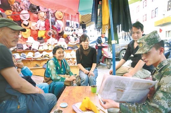 圖為拉薩警備區(qū)某團官兵為社區(qū)居民宣講政策。通訊員 涂君陽攝