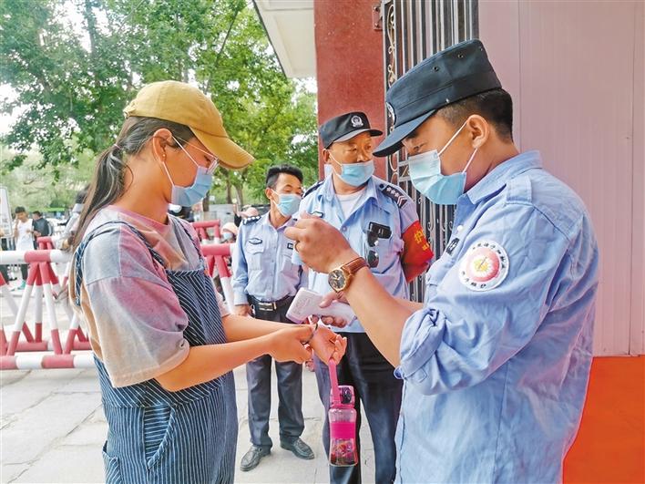 圖為在拉薩中學(xué)考點(diǎn)門口,工作人員對(duì)即將進(jìn)入考點(diǎn)熟悉環(huán)境的考生進(jìn)行體溫檢測(cè)和身份驗(yàn)證。記者 王莉 攝