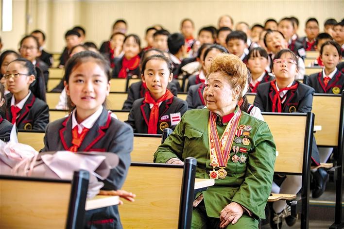 圖為抗美援朝老戰(zhàn)士楊秀珍與云大附中星耀學(xué)校小學(xué)部師生一同參加抗美援朝英雄故事分享會(huì)。新華社記者 江文耀 攝