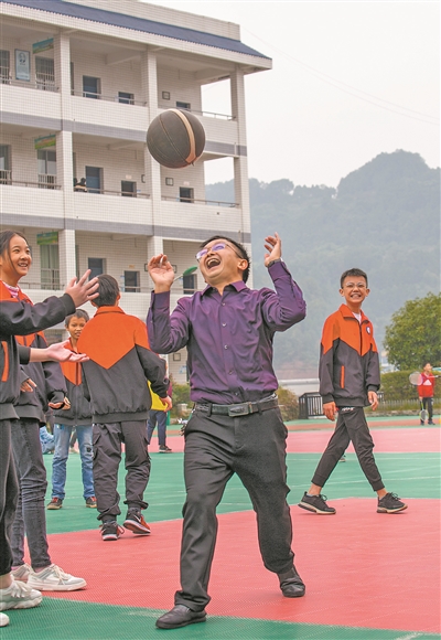 課余時間,李友生與孩子們打籃球玩鬧,開心得像個孩子。劉磊 攝