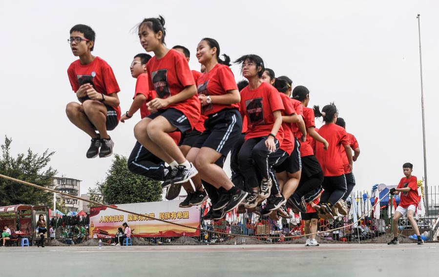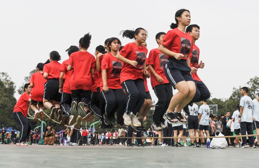 11月26日, 廣西大學(xué)附屬中學(xué)初中年級學(xué)生在集體跳繩比賽中。新華社記者張愛林?jǐn)z