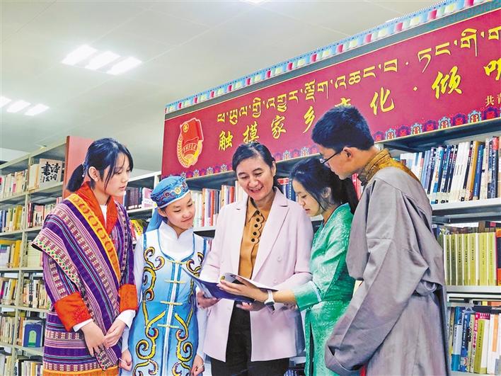 圖為共青團西藏自治區(qū)委員會副書記格桑卓瑪(左三)向武漢西藏中學的學生們介紹“觸摸家鄉(xiāng)變化·傾聽黨的聲音”主題書刊。央金 攝