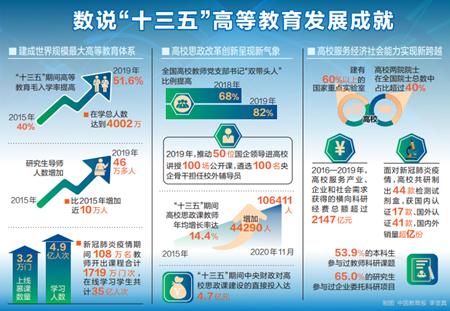 “我國已建成世界規(guī)模最大的高等教育體系。”吳巖介紹,“十三五”期間,高等教育毛入學(xué)率不斷提升,由2015年的40%提高到2019年的51.6%,在學(xué)總?cè)藬?shù)達(dá)到4002萬。