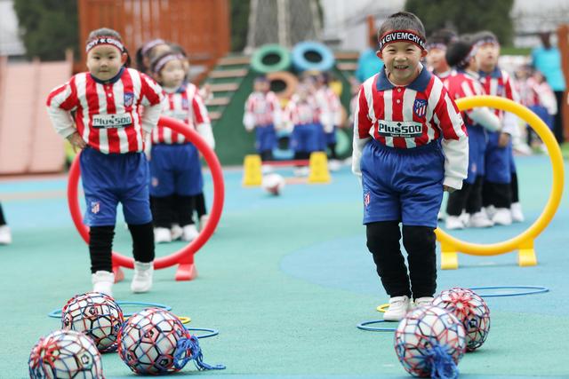 12月7日,淮北市第二實(shí)驗(yàn)幼兒園的小朋友在足球課上參加足球游戲。