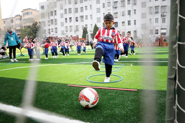 12月7日,淮北市第二實(shí)驗(yàn)幼兒園的小朋友在足球課上學(xué)習(xí)踢足球。