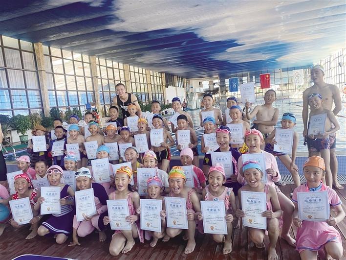 一批小學(xué)生完成游泳培訓(xùn)拿到證書。