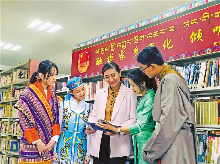共青團(tuán)西藏自治區(qū)委員會(huì)副書(shū)記格桑卓瑪(中),在武漢西藏中學(xué)設(shè)立的“觸摸家鄉(xiāng)變化·傾聽(tīng)黨的聲音”主題書(shū)刊欄處向?qū)W生們介紹相關(guān)書(shū)籍。