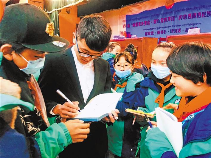 宣講活動(dòng)過(guò)程中,共青團(tuán)西藏自治區(qū)委員會(huì)副書(shū)記格桑卓瑪、西藏青年報(bào)社副社長(zhǎng)洛桑頓珠給6所學(xué)校內(nèi)地西藏班的學(xué)生們贈(zèng)送了《西藏青年報(bào)》《西藏青年》等刊物和書(shū)籍。格桑卓瑪語(yǔ)重心長(zhǎng)地囑咐孩子們:“作為新時(shí)代的新青年,要時(shí)刻牢記時(shí)代賦予的新使命,要用新時(shí)代的標(biāo)尺審視自己,用科學(xué)文化武裝自己,淡化宗教消極影響,在新征程的熔爐中鍛造自己,努力使自己成為堪當(dāng)民族復(fù)興大任的新青年,在全面建設(shè)社會(huì)主義現(xiàn)代化國(guó)家新征程中貢獻(xiàn)自己的青春力量,做神圣國(guó)土的守護(hù)者、幸福家園的建設(shè)者,在青春的閃光中踐行‘感黨恩、愛(ài)核心、聽(tīng)黨話、跟黨走’的家國(guó)情懷?!?/p>