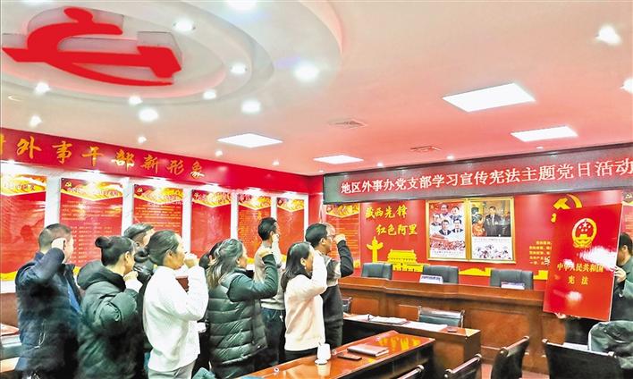 地區(qū)外事辦黨支部組織黨員干部在機(jī)關(guān)活動(dòng)場(chǎng)所舉辦學(xué)習(xí)宣傳憲法主題黨日活動(dòng)。