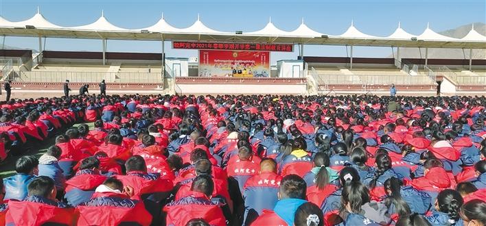 圖為拉薩阿里河北完全中學(xué)師生在校運(yùn)動場舉行2021年春季開學(xué)典禮。圖片由拉薩阿里河北完全中學(xué)提供