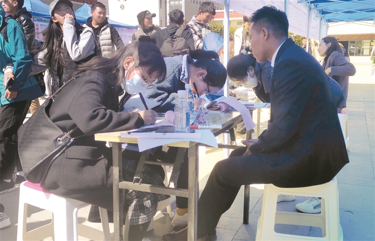 拉巴占堆是西藏大學(xué)藏語言文學(xué)師范專業(yè)的一名大四畢業(yè)生,他曾在拉薩北京實(shí)驗(yàn)中學(xué)實(shí)習(xí)過,對教育工作充滿熱情。招聘會(huì)現(xiàn)場,他向卓夢培訓(xùn)等教育相關(guān)企業(yè)都投遞了簡歷。“我投了幾份簡歷了,希望能夠找到和自己專業(yè)相關(guān)的工作,實(shí)現(xiàn)自己的價(jià)值?!崩驼级颜f。
