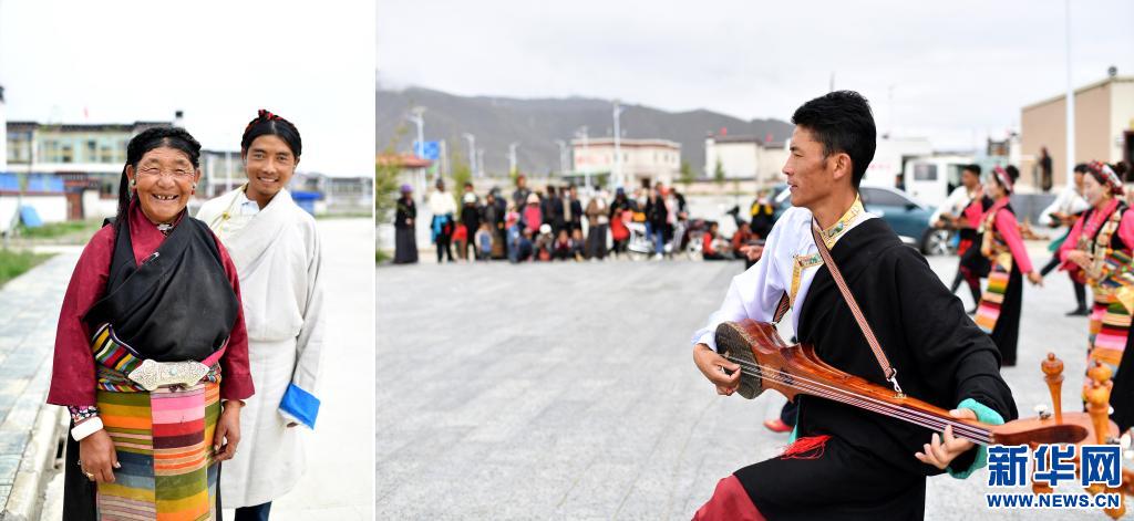 拼版照片:左圖為西藏日喀則市拉孜縣查務(wù)鄉(xiāng)明瑪村村民倉瓊(左)和兒子群培次仁;右圖為拉孜縣民間藝術(shù)團在明瑪村易地搬遷點為村民表演(2020年8月2日攝)。新華社記者 詹彥 攝