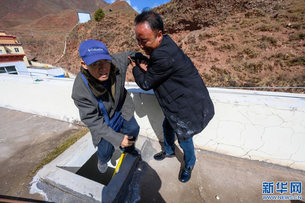 5月3日,在西藏昌都市類烏齊縣吉多鄉(xiāng)小學(xué),李純民(左)在吉多鄉(xiāng)小學(xué)校長鄧增群培的幫助下,爬上學(xué)生食堂樓頂,監(jiān)督太陽能熱水器的維修工作。新華社記者 劉金海 攝