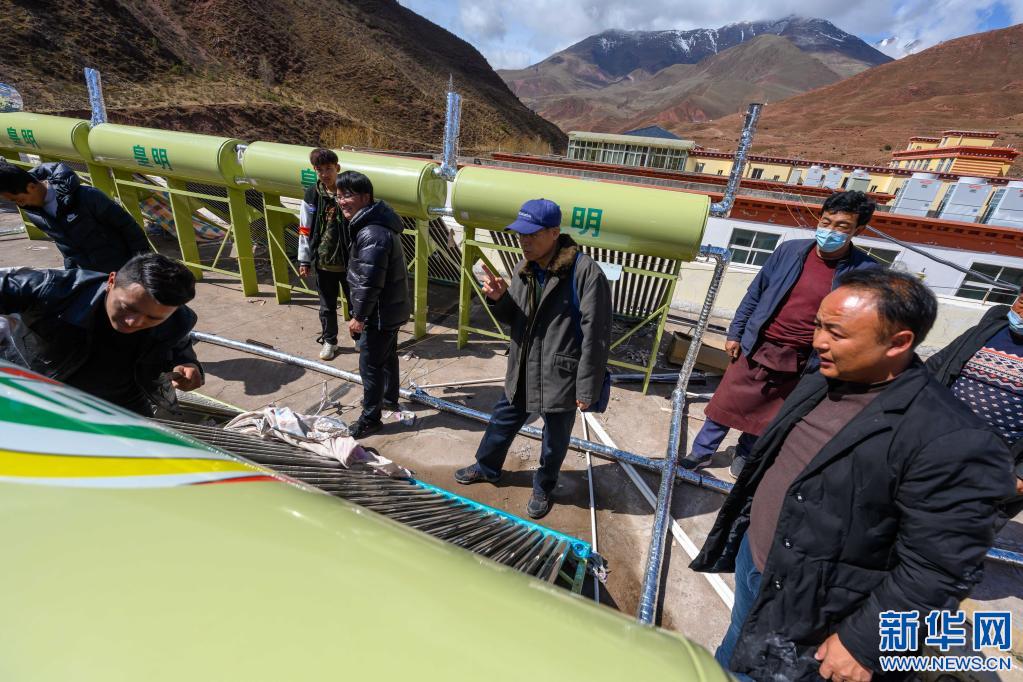 5月3日,在西藏昌都市類烏齊縣吉多鄉(xiāng)小學(xué),李純民(中)在吉多鄉(xiāng)小學(xué)學(xué)生食堂樓頂,監(jiān)督太陽能熱水器的維修工作。2014年至2020年,“齊興”助學(xué)獎勵基金通過多種方式,籌集資金200多萬,為類烏齊縣12所鄉(xiāng)鎮(zhèn)小學(xué)安裝太陽能熱水器和多媒體教學(xué)一體機(jī)。新華社記者 劉金海 攝
