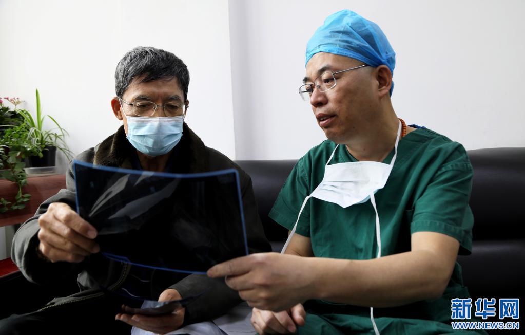 5月12日,李純民(左)與西藏昌都市藏醫(yī)院骨科天津援藏的李明新主任查看右腳殘疾女童扎西措姆的X光片。新華社記者 普布扎西 攝