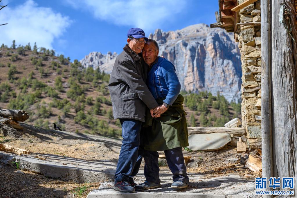 5月3日,李純民前往西藏昌都市類烏齊縣伊日鄉(xiāng)崩日村看望1979年下鄉(xiāng)工作時(shí)結(jié)識的房東一家。這是房東的大兒子澤仁多加(右)在家門口熱情歡迎他。新華社記者 劉金海 攝