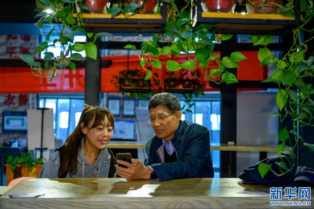4月22日,在天津大學(xué)一學(xué)生食堂,李純民(右)與“齊興”助學(xué)獎勵基金資助的藏族學(xué)生扎西措姆交流。新華社記者 劉金海 攝