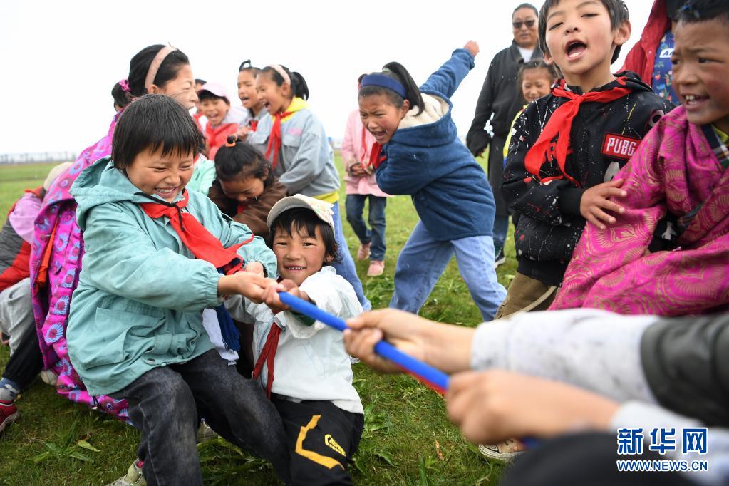 7月14日,河曲馬場小學(xué)老師道布旦(中)在草原上組織孩子們拔河。新華社記者 陳斌 攝