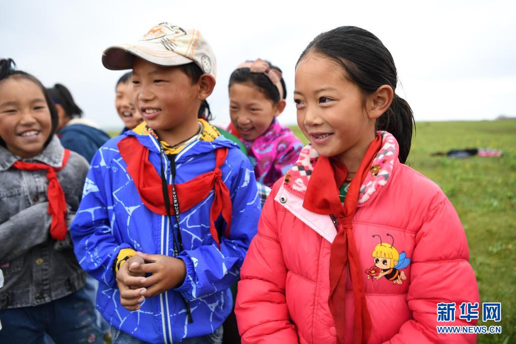 7月14日,河曲馬場小學(xué)的孩子在草原上唱歌。新華社記者 杜哲宇 攝