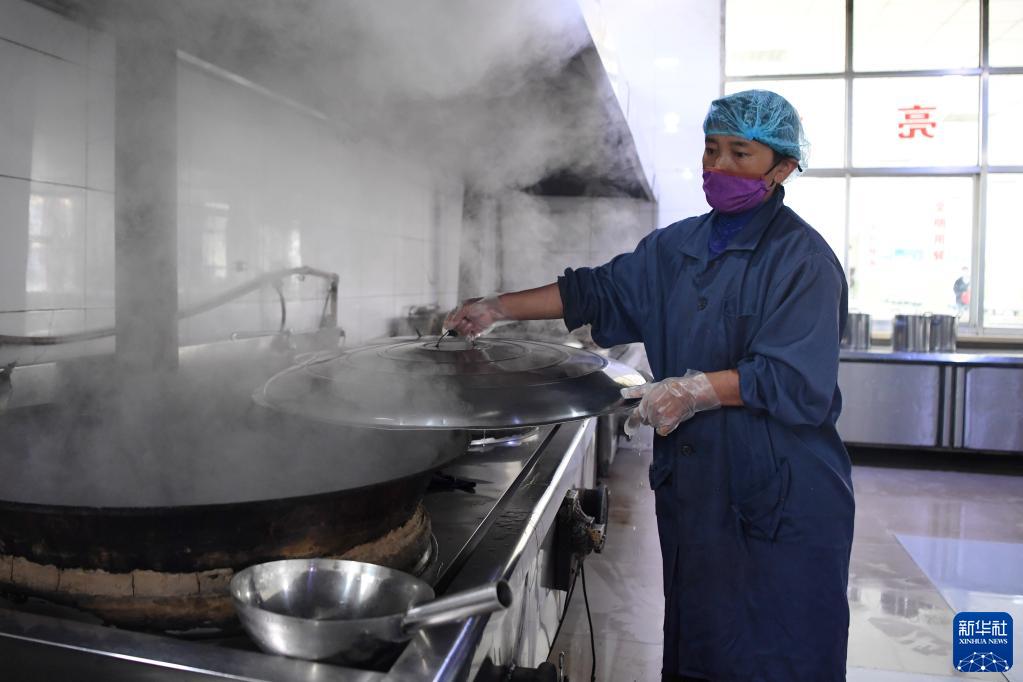 碌曲縣藏族中學(xué)學(xué)生食堂的工作人員在給學(xué)生準(zhǔn)備晚飯(8月30日攝)。新華社記者 杜哲宇 攝