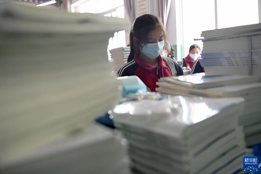 碌曲縣藏族中學(xué)的高二學(xué)生在教室里整理新學(xué)期課本(8月30日攝)。新華社記者 陳斌 攝
