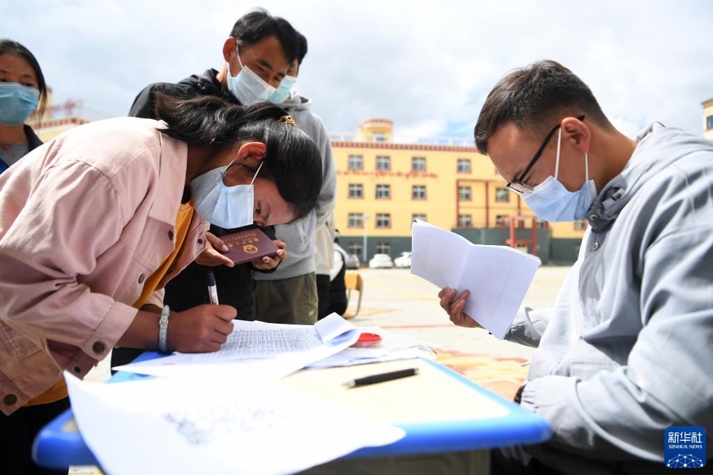 碌曲縣藏族中學(xué)高一新生填寫(xiě)報(bào)到信息(8月30日攝)。新華社記者 杜哲宇 攝