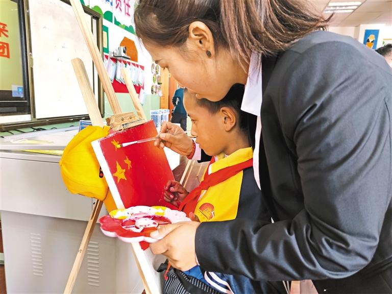 在桑珠孜區(qū)東嘎鄉(xiāng)中心小學(xué)少年宮,繪畫愛好者在輔導(dǎo)老師的指導(dǎo)下描畫國旗