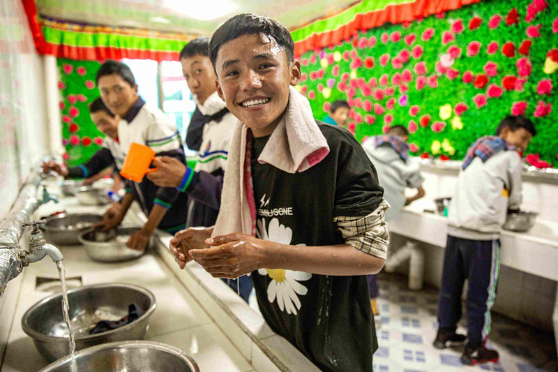 走進(jìn)薩迦中學(xué)新投入使用的女生宿舍樓,可以看到每個(gè)房間門口都布置了信息欄,詳細(xì)介紹了入住學(xué)生信息、室長和帶教老師信息;門口統(tǒng)一配備鞋架,孩子們在門口換好鞋再進(jìn)房間,保持了室內(nèi)地面的清潔。室內(nèi)外隔間是統(tǒng)一的儲(chǔ)物柜,存放學(xué)生私人用品;內(nèi)間是整整齊齊8個(gè)上下鋪位,中間合用的臺(tái)子上牙刷、水杯整齊劃一擺放;靠窗有統(tǒng)一的臉盆架;每個(gè)樓層都有3處盥洗室。由于縣中學(xué)內(nèi)沒有學(xué)生浴室,新宿舍盥洗室內(nèi)還特地安裝了電加熱的恒溫暖水設(shè)備。入冬后,薩迦中學(xué)的孩子們終于能夠在宿舍洗漱時(shí)用上熱水了。