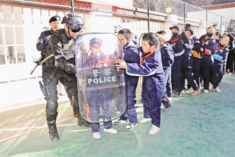圖為比如縣公安局民警正在為比如縣第三小學(xué)五年級(jí)的學(xué)生講解警用盾牌的使用方法。記者 萬靖 攝