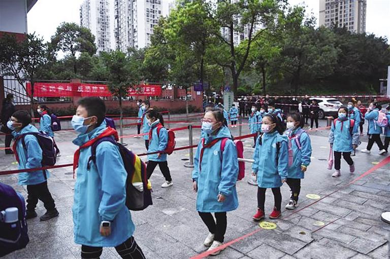 學(xué)生們戴著口罩有序進(jìn)入校園。