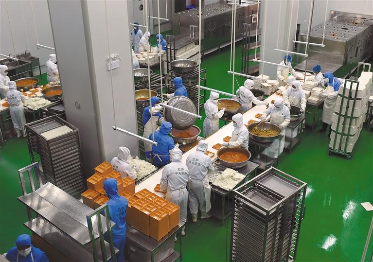 圖為凈土拉薩中央廚房?jī)?nèi),工作人員在將飯菜裝盒。記者 洛桑 旦增蘭澤 王敏 攝