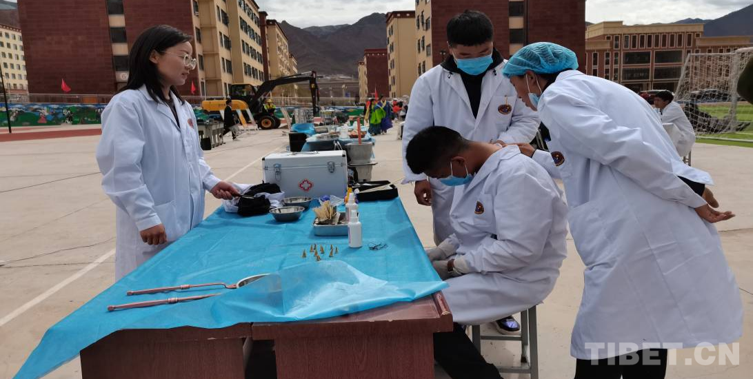 藏醫(yī)藏藥專業(yè)的同學(xué)們在老師的指導(dǎo)下,有條不紊地進行著火灸,三兩個同學(xué)一起配合,在“患者”頸部選定穴位,點火,看火,直至火焰熄滅,一次火灸時間為10至15分鐘。在火灸演示后方,同學(xué)們正展示著藏藥足療,濃郁的藥草味、熟練的手法盡顯藏醫(yī)養(yǎng)生療法特色。